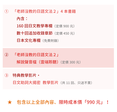 特典教學影片「日文助詞大揭密」,是將我們先前錄製的一系列助詞教學影片,以高畫質的形式、免費提供給購買書籍的讀者觀看,共11集,名額有限喔!