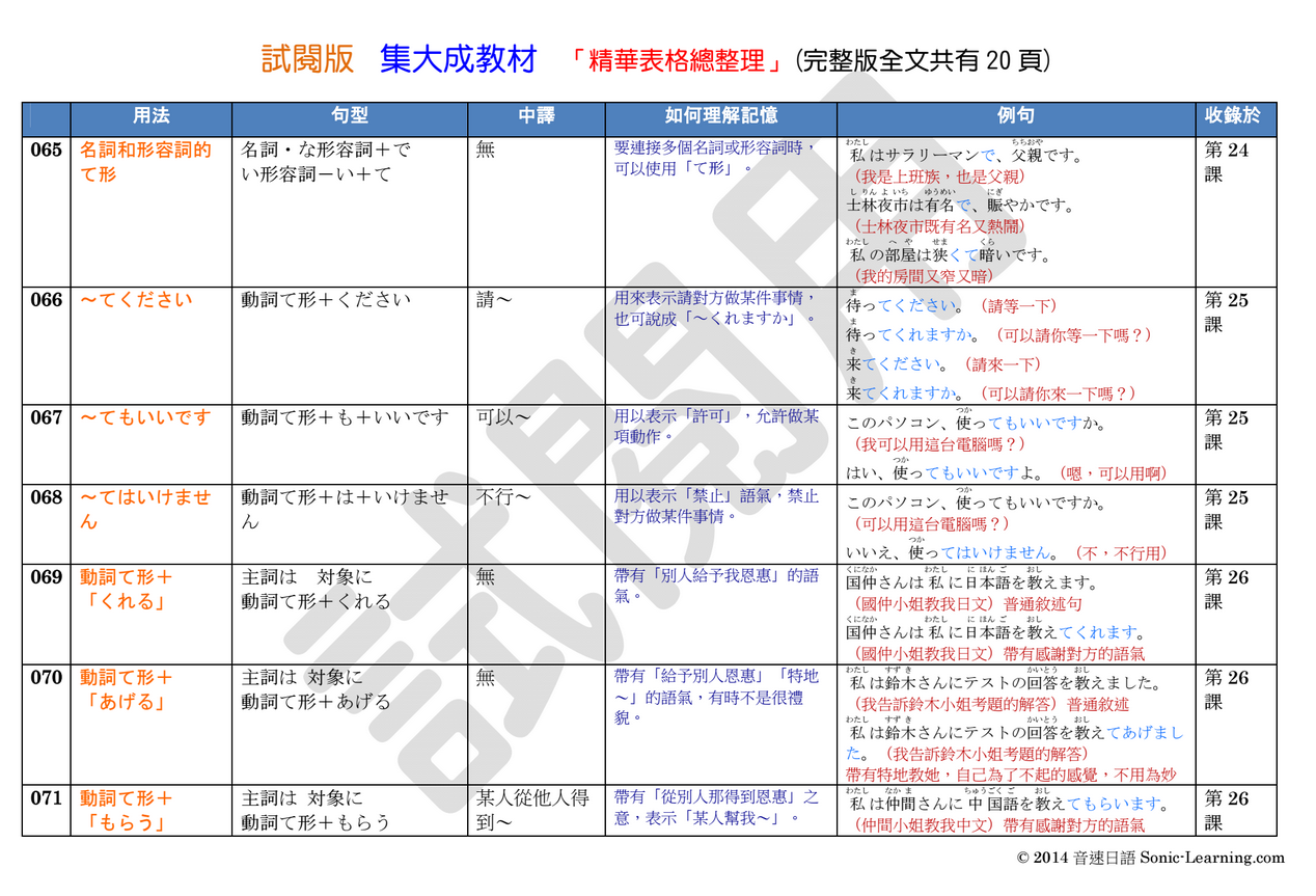 將「集大成教材」教材1000多頁的內容,彙整為各20頁左右的圖表,圖表包含「文法句型、中譯、如何理解記憶、例句等」項目,以PDF電子書的形式提供。
