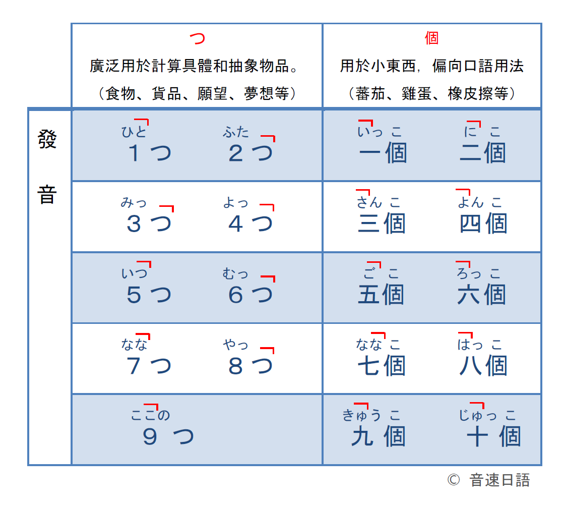 | 發音 | 1つ(ひとつ) 2つ(ふたつ) | 一個(いっこ) 二個(にこ) |
