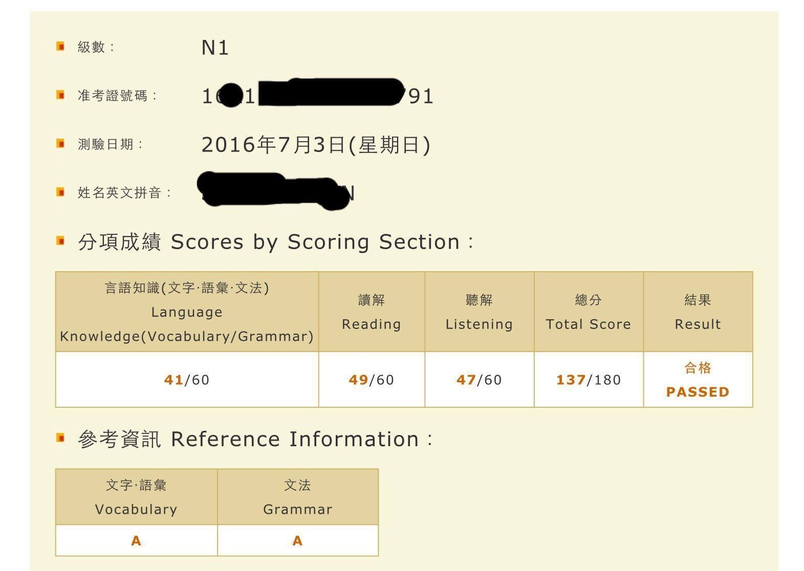 考試經驗:2016/07/03第一次報考日檢(N1),