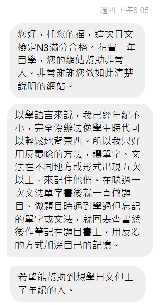 ✅ 讀者「N同學」的「1年內從50音到N3滿分合格」學習技巧分享