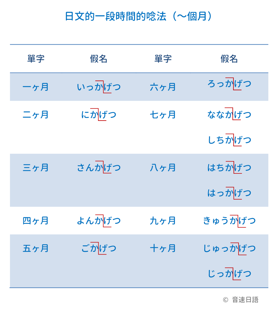 | 一ヶ月 | いっかげつ | 六ヶ月 | ろっかげつ |