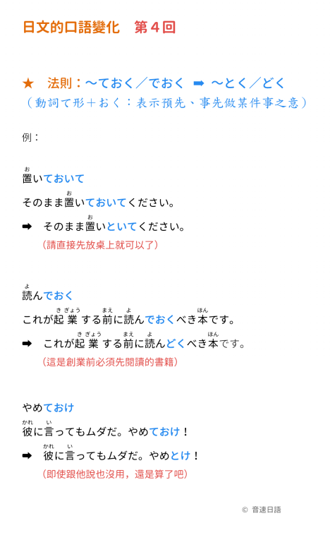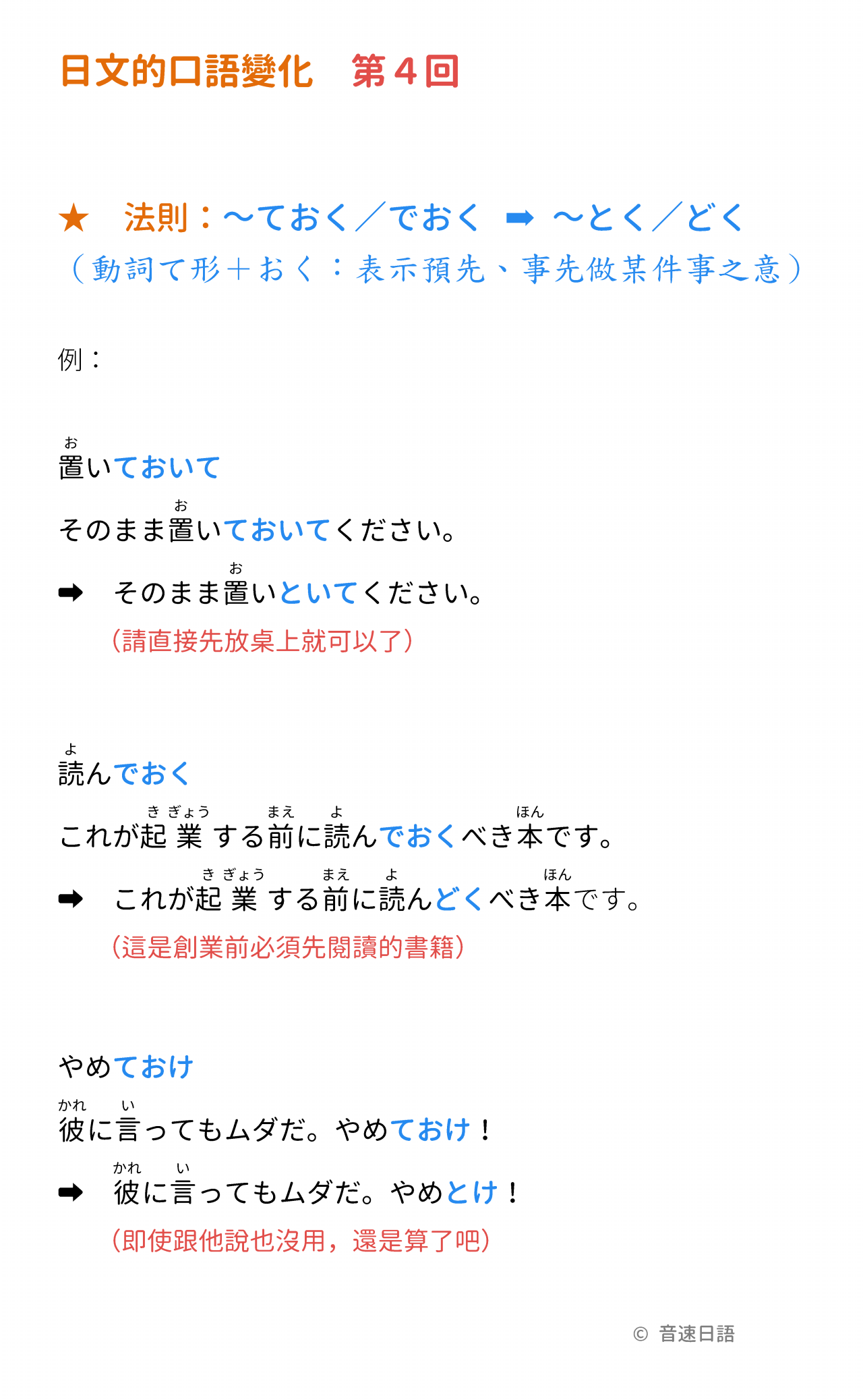 ★ 法則:「~ておく/でおく」➠「~とく/どく」