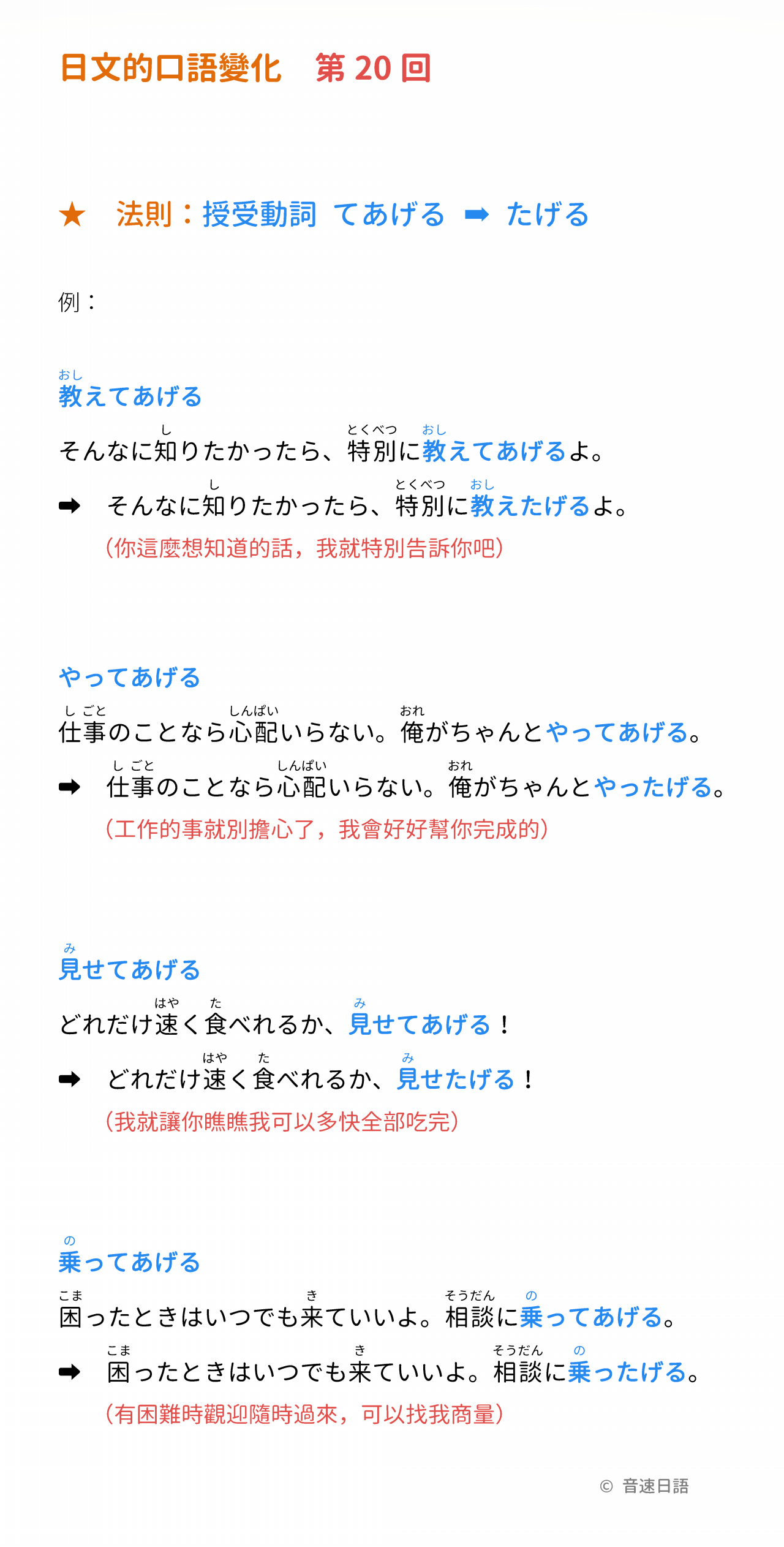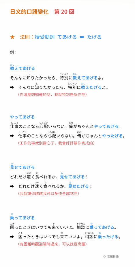 法則:授受動詞「てあげる」→「たげる」