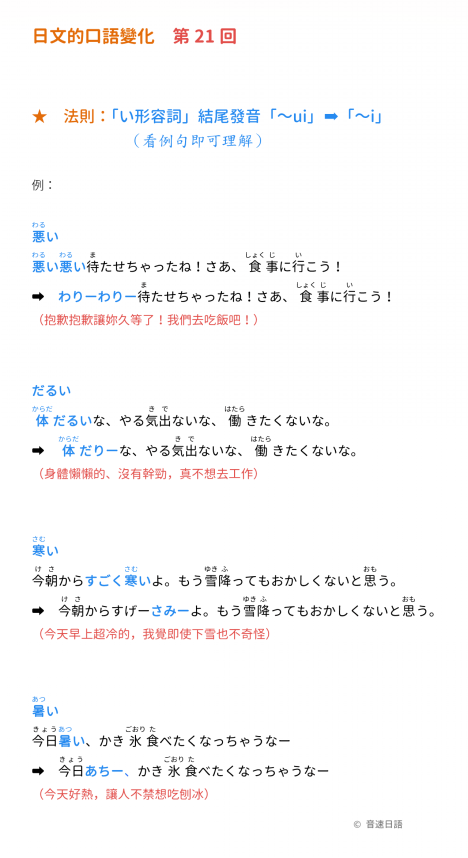 法則:「い形容詞」結尾發音「~ui」→「~i」