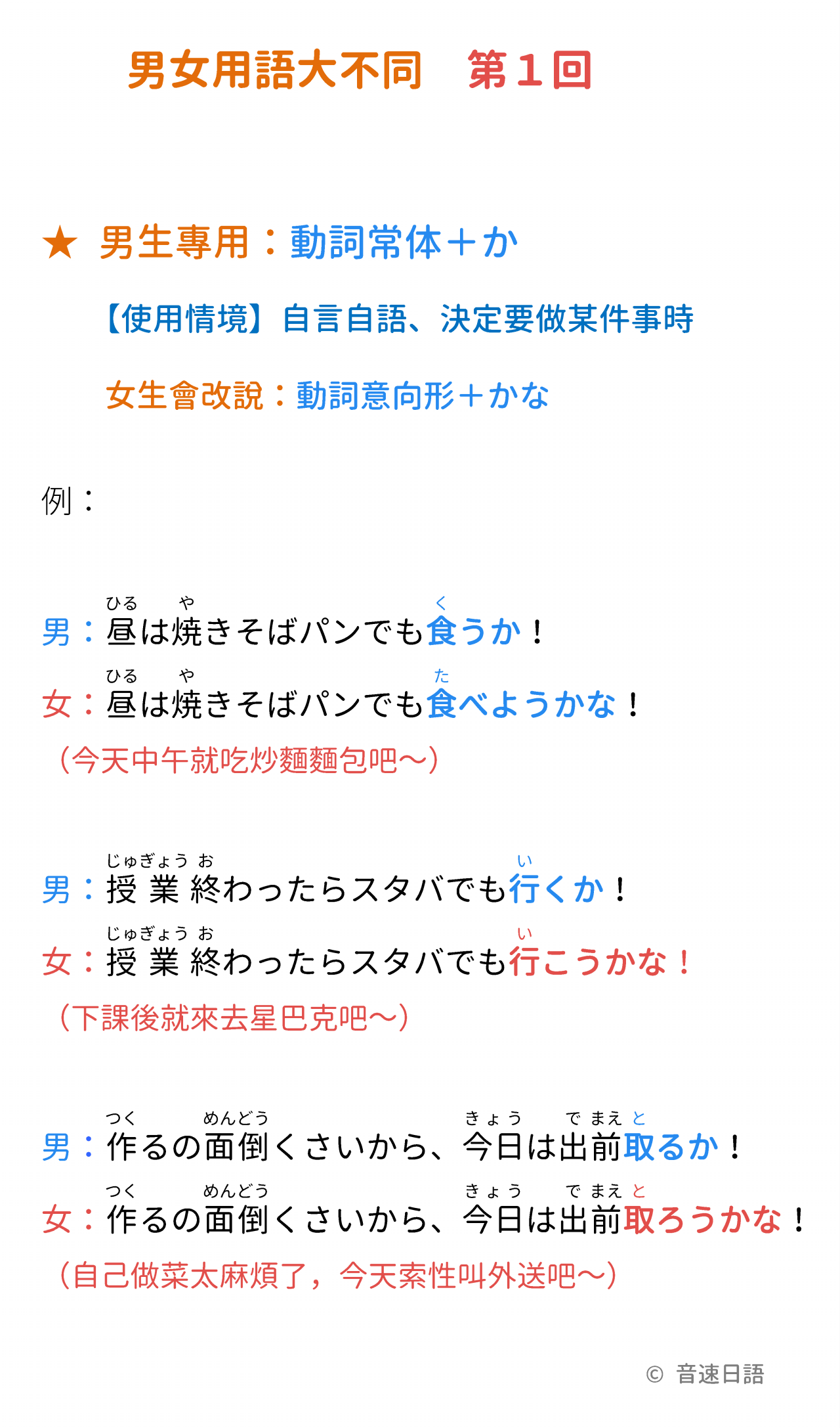 日文當中,男生和女生有時用語和用字遣詞會不太一樣,我們一起來看看吧~
