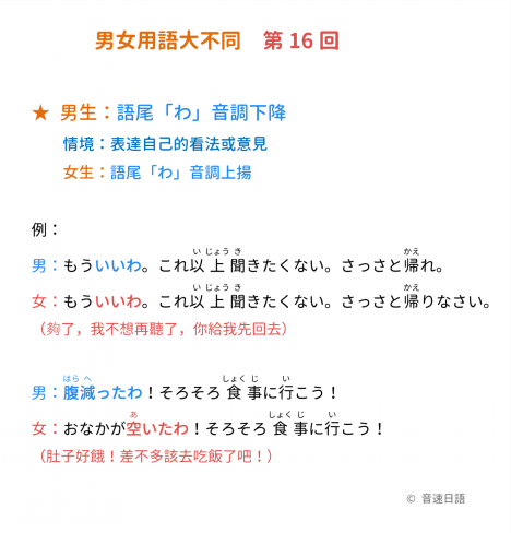 女生:語尾「わ」音調上揚