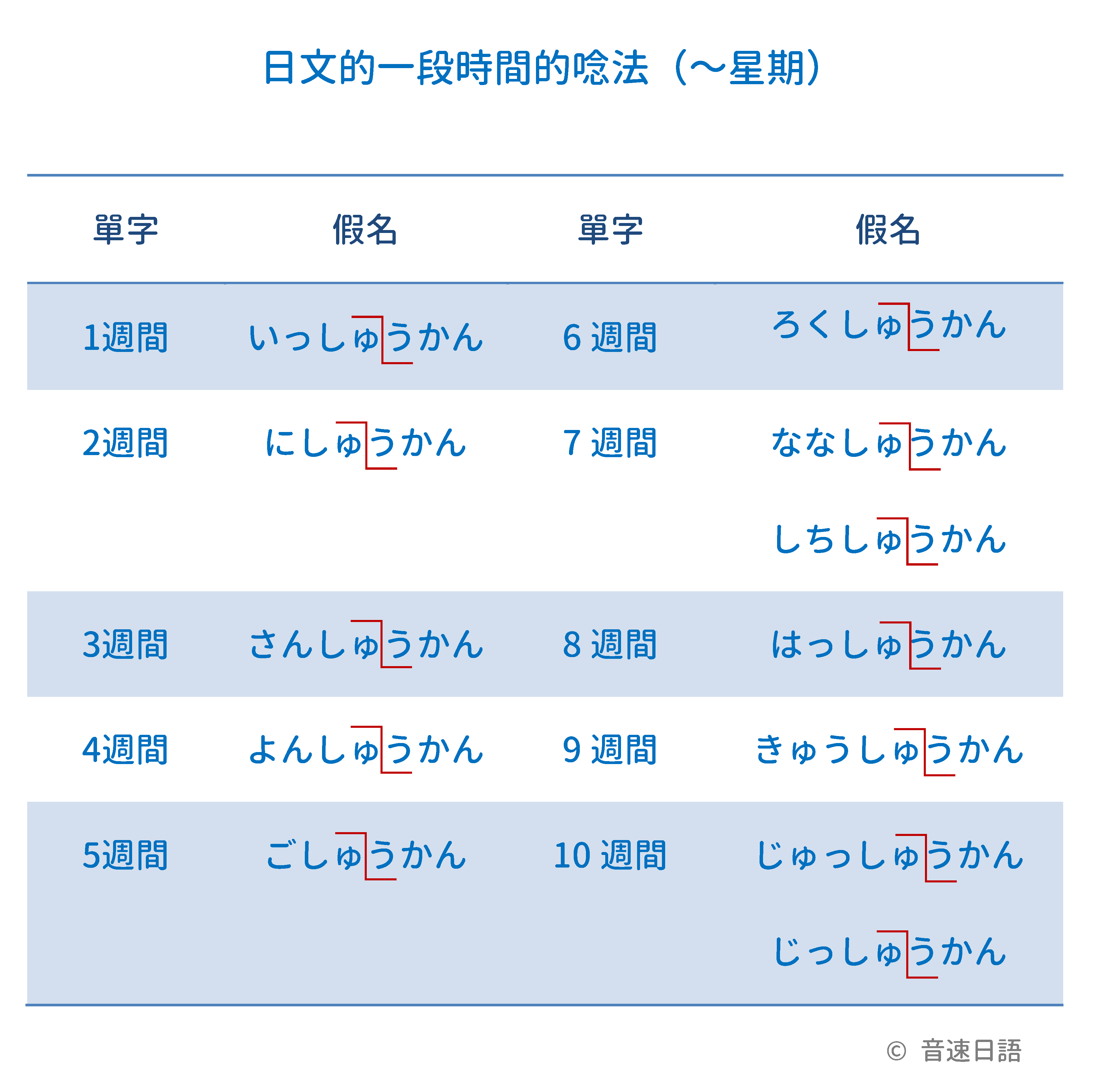 | 1週間 | いっしゅうかん | 6週間 | ろくしゅうかん |