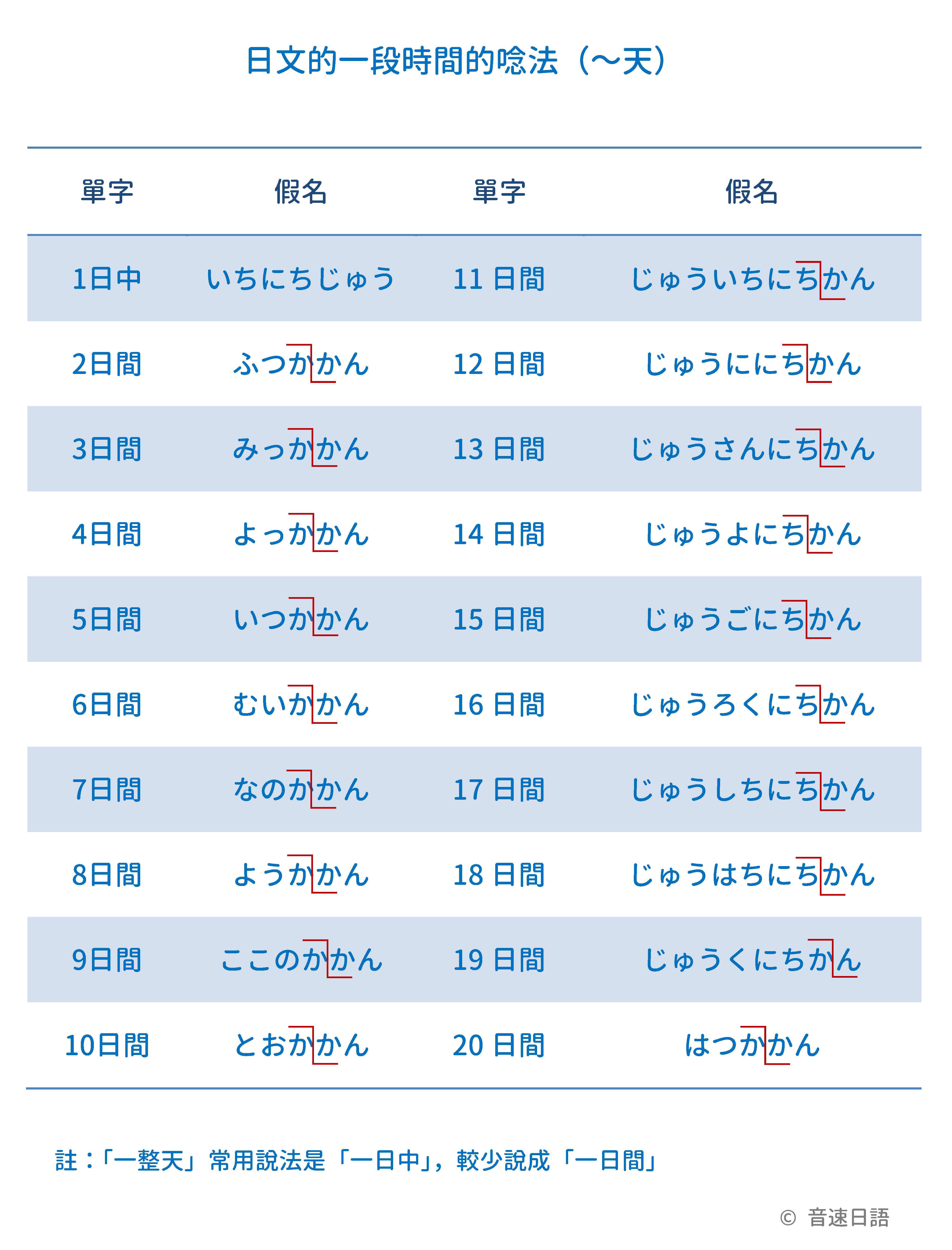 | 1日中 | いちにちじゅう | 11日間 | じゅういちにちかん |