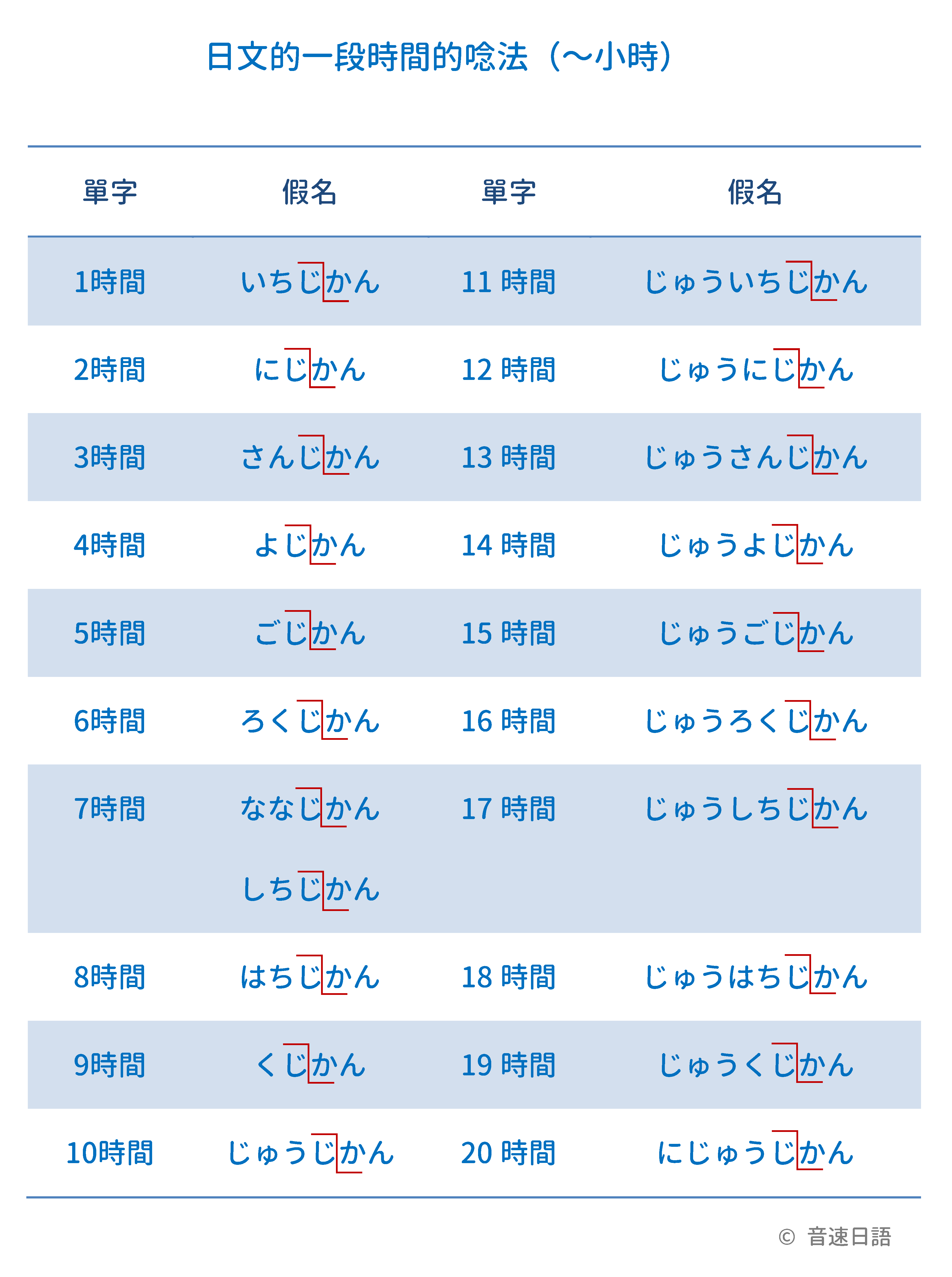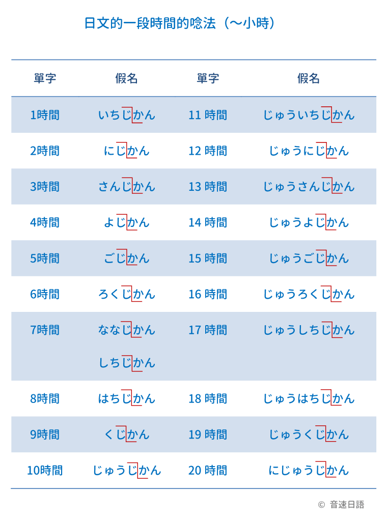 | 10時間 | じゅうじかん | 20時間 | にじゅうじかん |