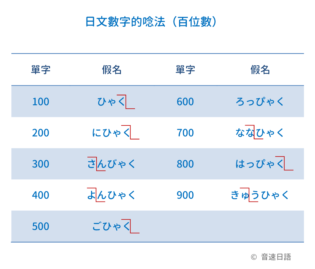 | 100 | ひゃく | 600 | ろっぴゃく |