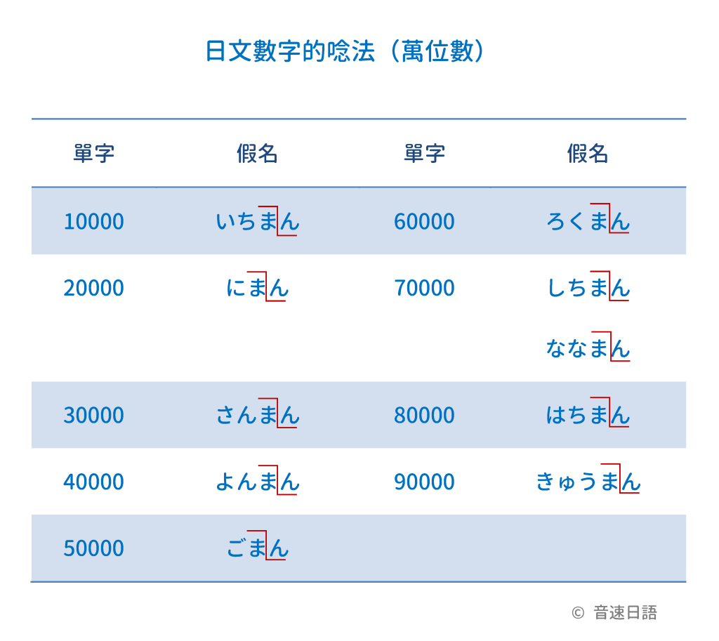 | 20000 | にまん | 70000 | しちまん ななまん |