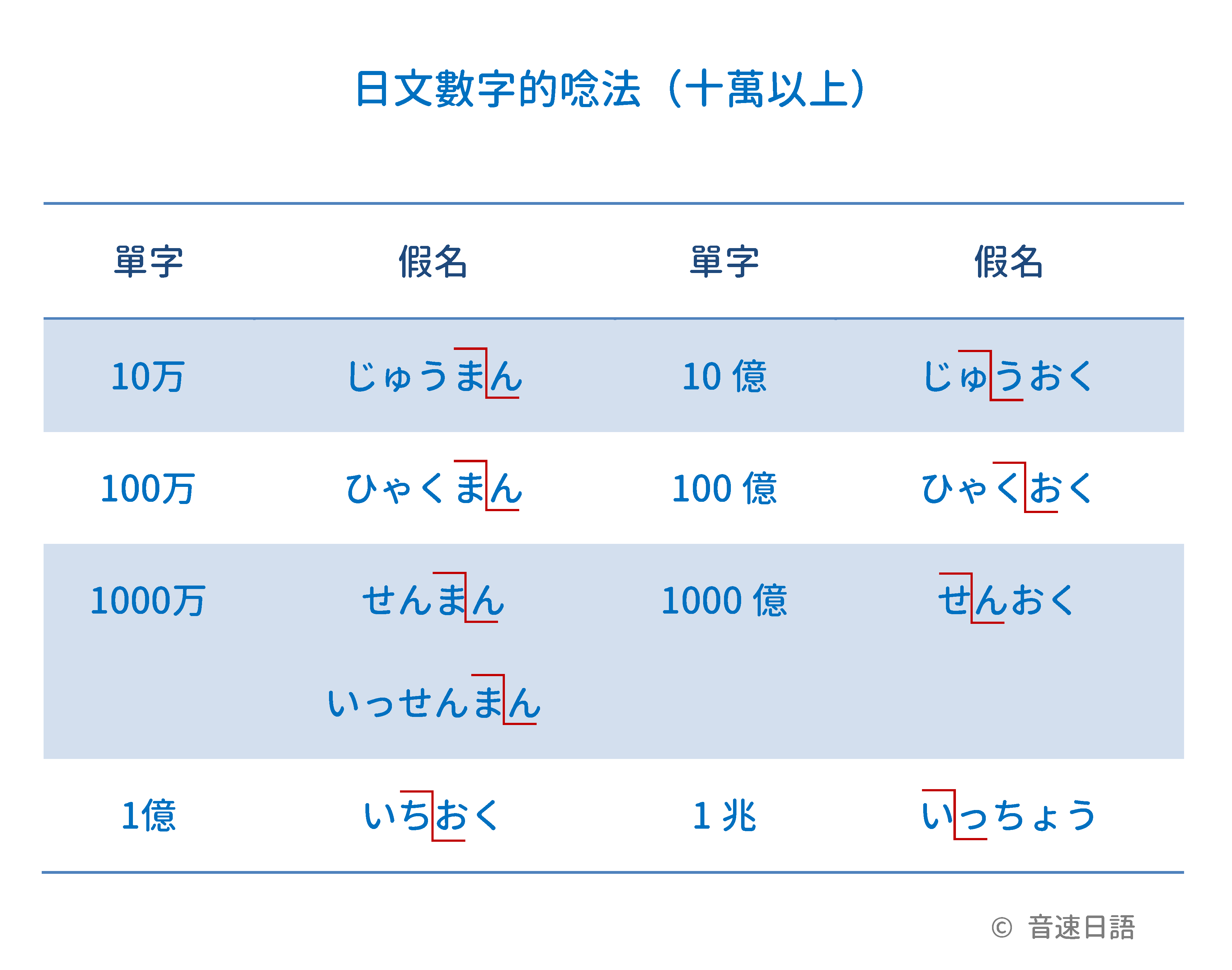 | 10万 | じゅうまん | 10億 | じゅうおく |