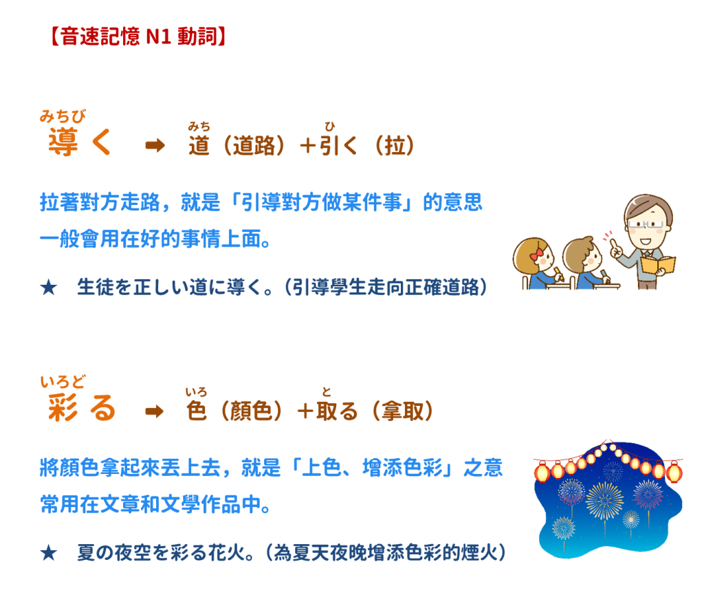 今天我們舉「導く・彩る」為例,教大家如何快速記住〜