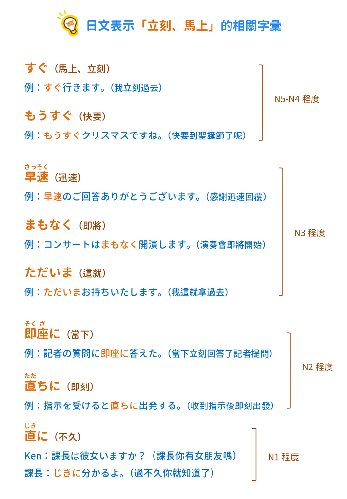 表示「立刻、馬上」相關意思的字彙有很多種,