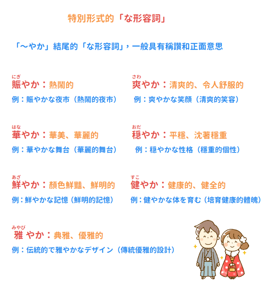 「〜やか」結尾的「な形容詞」,一般具有稱讚和正面意思