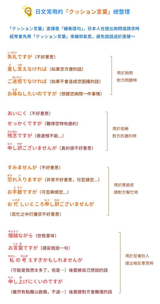 ⭐ 另外,「あいにく」這類的字彙,日文稱為「クッション言葉」