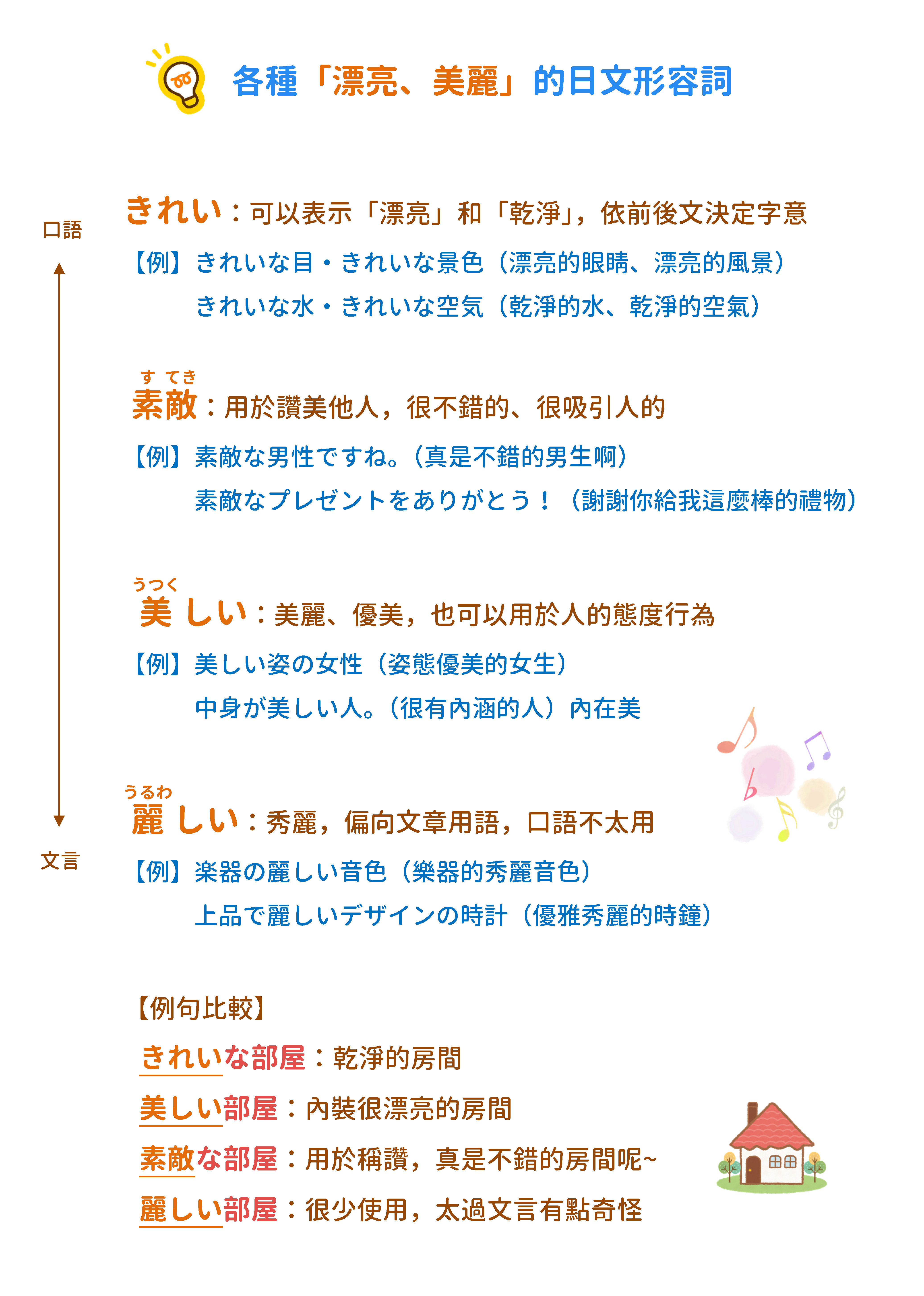 相似的日文字彙有很多,例如:きれい・美しい・麗しい等等