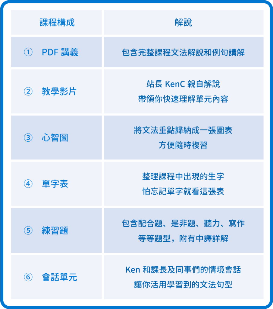 ⭐ 具體來說,我們的文法課程,包含以下項目: