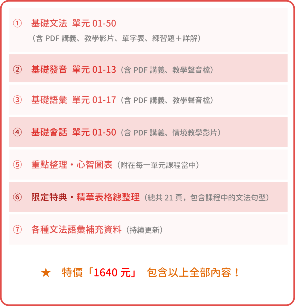 我們具體介紹一下,文法課程包含哪些「內容」和「特典」,幫助你更快學好日文。