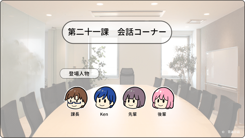 以Ken和課長及同事們為主角的情境會話,學習生活必備的日文語句。