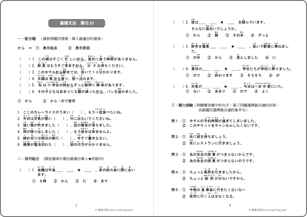 每堂課後面,都附有練習題,我們很用心編寫這些題目,難度會比較高一點點,不過如果你能順利答對,那麼日文考試和生活會話閱讀等等,對你來說就不會是問題。