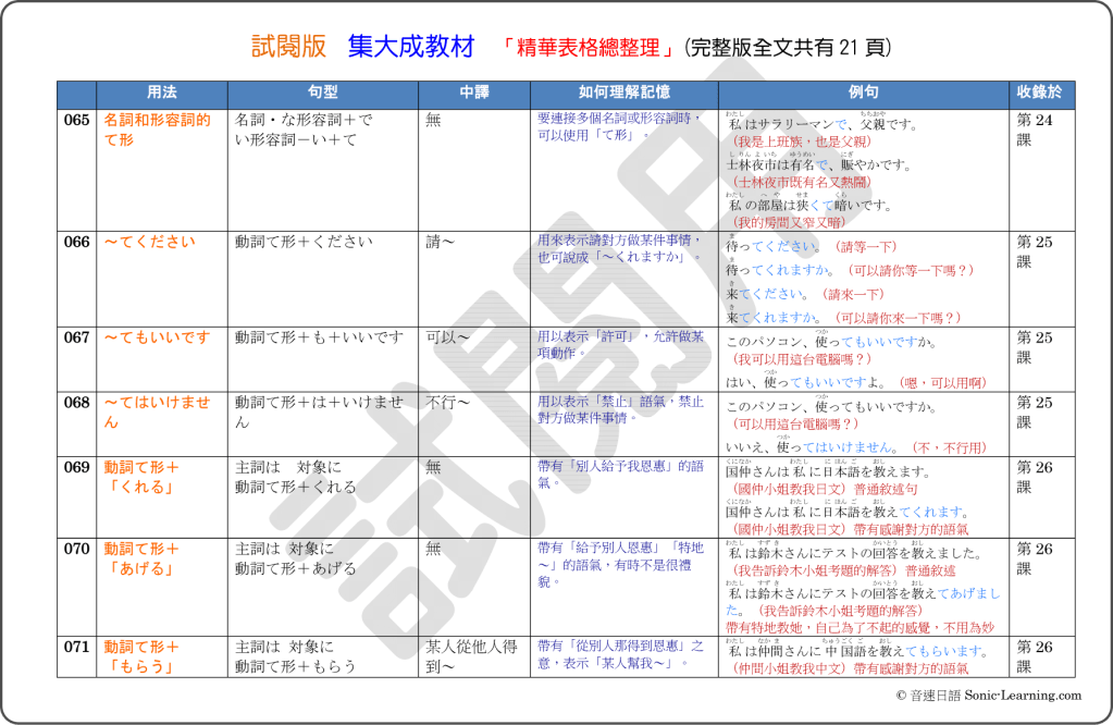 將「集大成教材」的50單元文法課程內容,彙整為21頁左右的圖表,