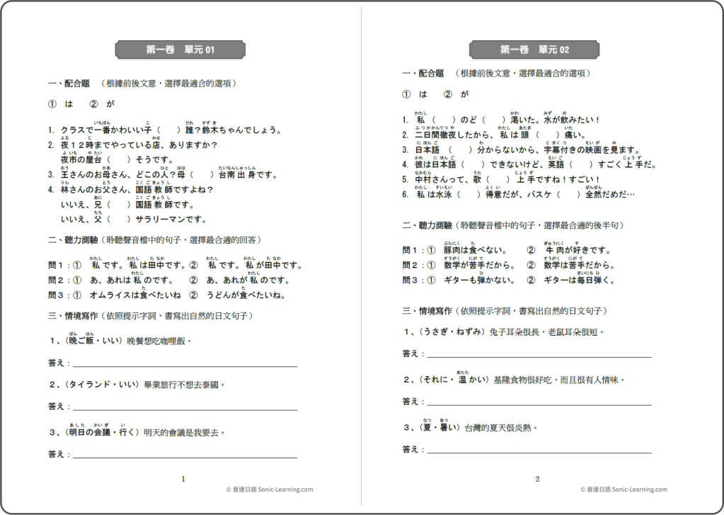 每堂課後面,都附有練習題,我們很用心編寫這些題目,難度會比較高一點點,不過如果你能順利答對,那麼日文考試和生活會話閱讀等等,對你來說就不會是問題。