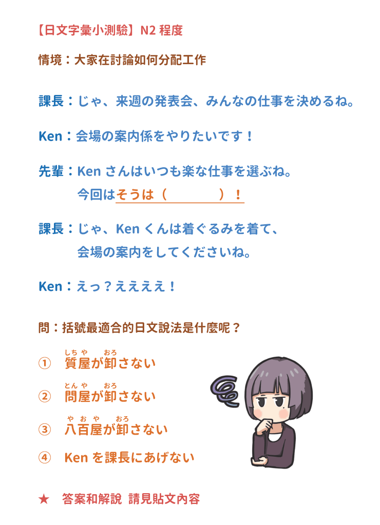 ✅ 因此,正確答案就是:② 問屋が卸さない