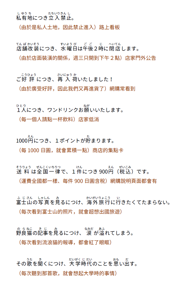【文法解說】~につき、~につけ