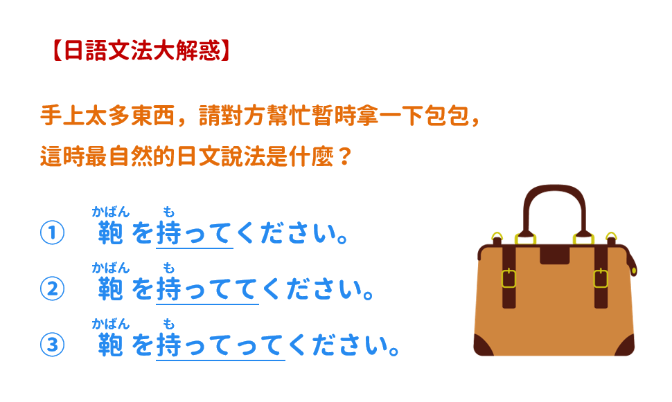 問題:手上太多東西,要請對方幫忙拿一下包包,