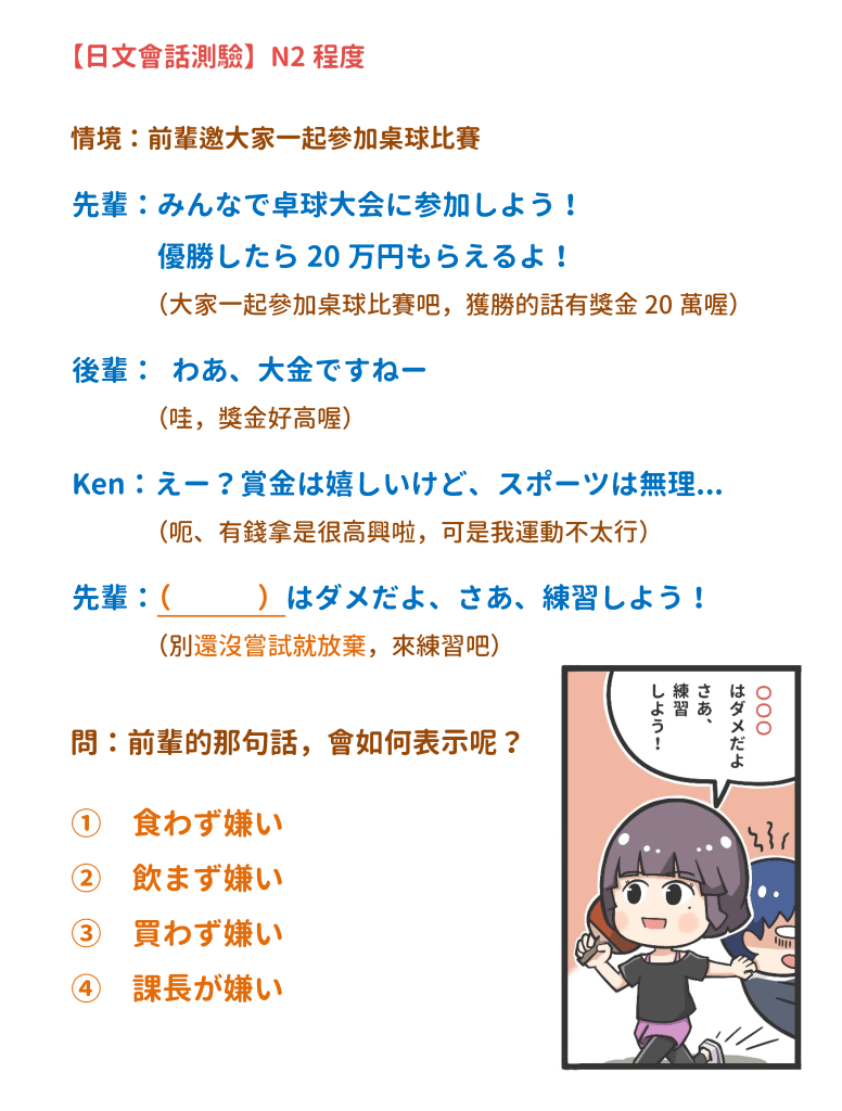 Filed under: viii 文法情境測驗 N3-N2 | 【N2】食わず嫌い? 已關閉迴響。