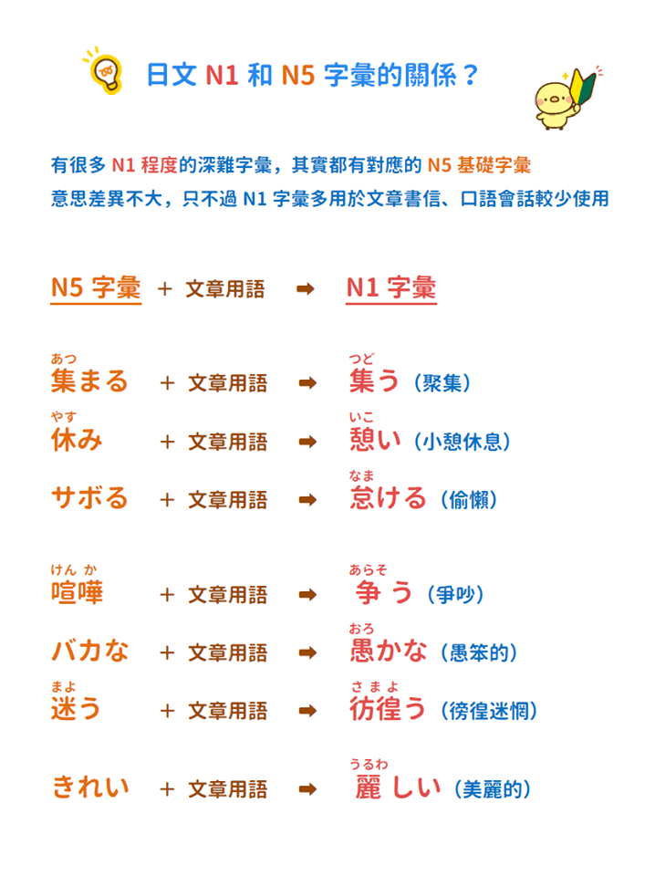 有很多N1程度的單字,其實都有對應的N4-N5基礎字彙,