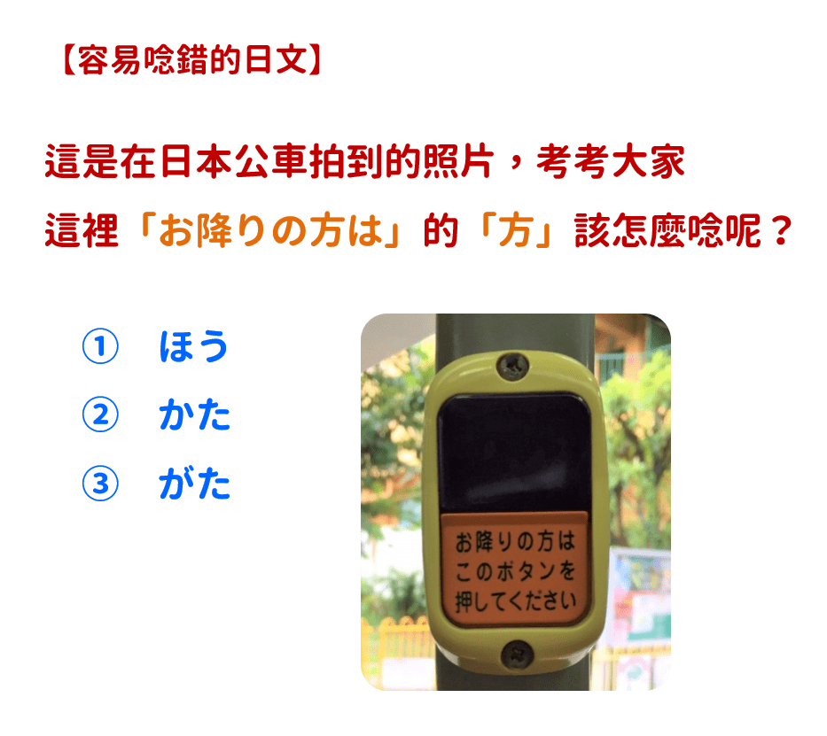 請問照片中「お降りの方は」的「方」,該怎麼唸才正確呢?