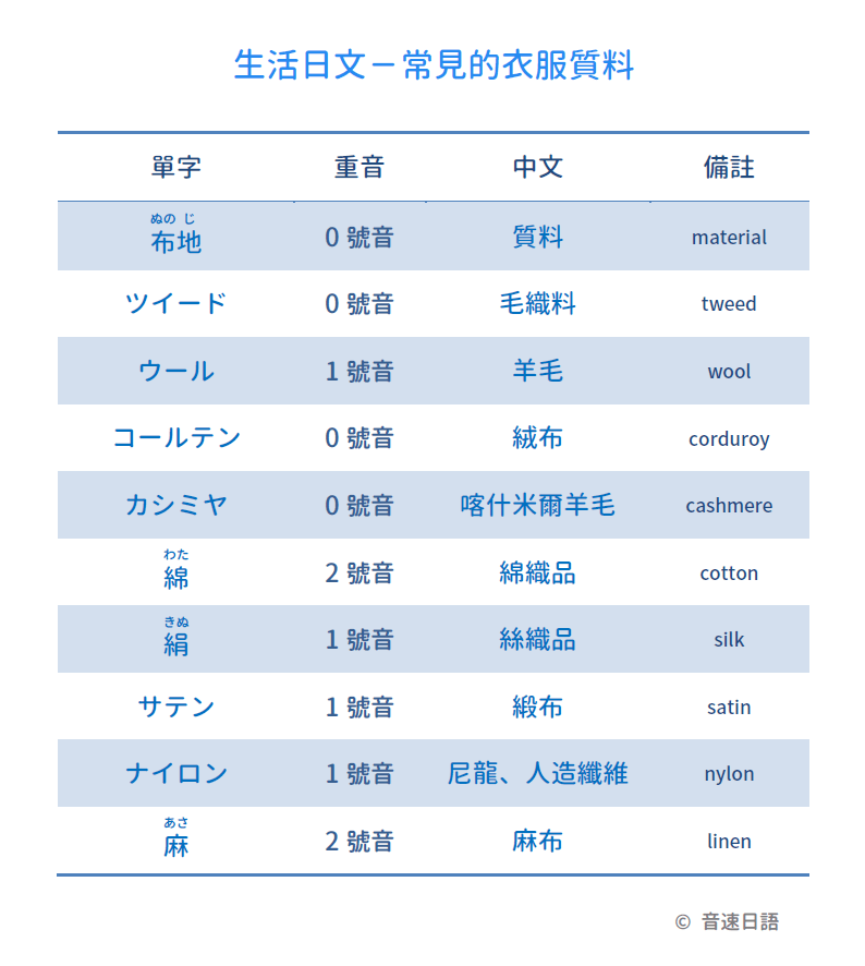 【生活日文字彙06】常見的衣服質料