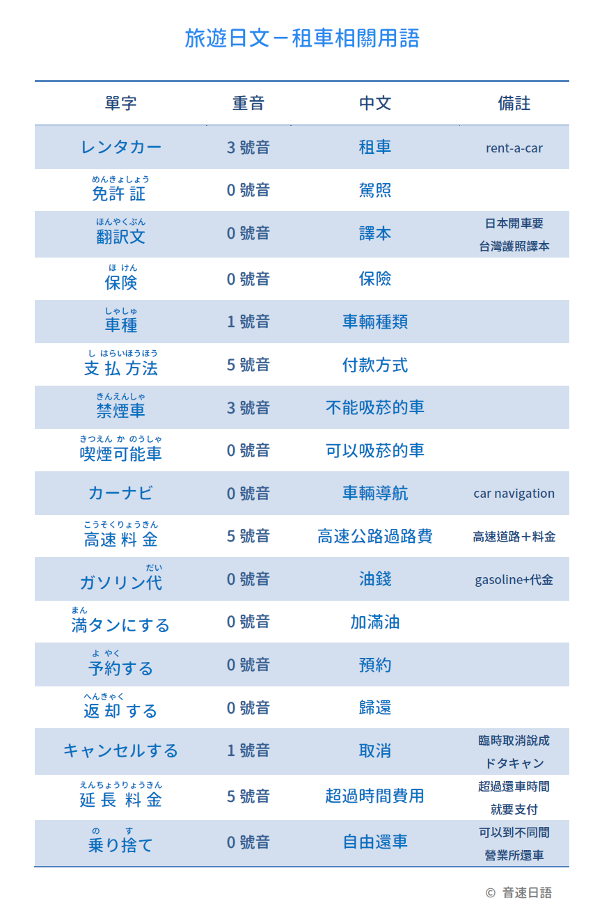 【旅遊日文字彙27】租車相關用語