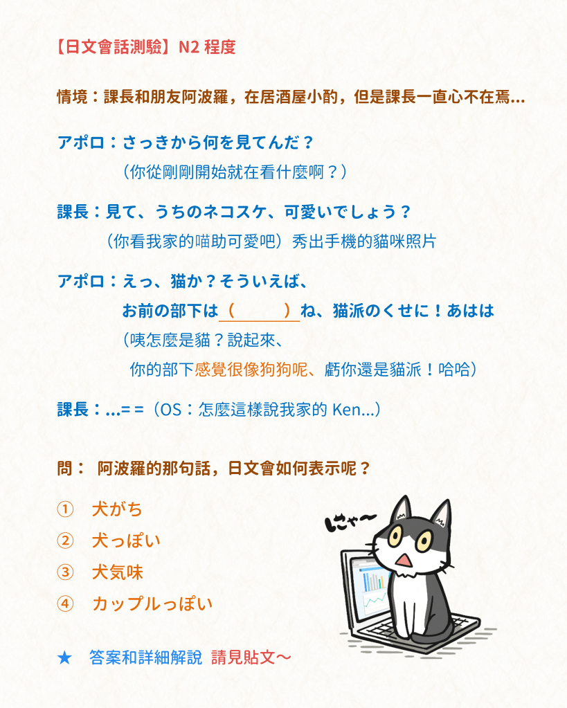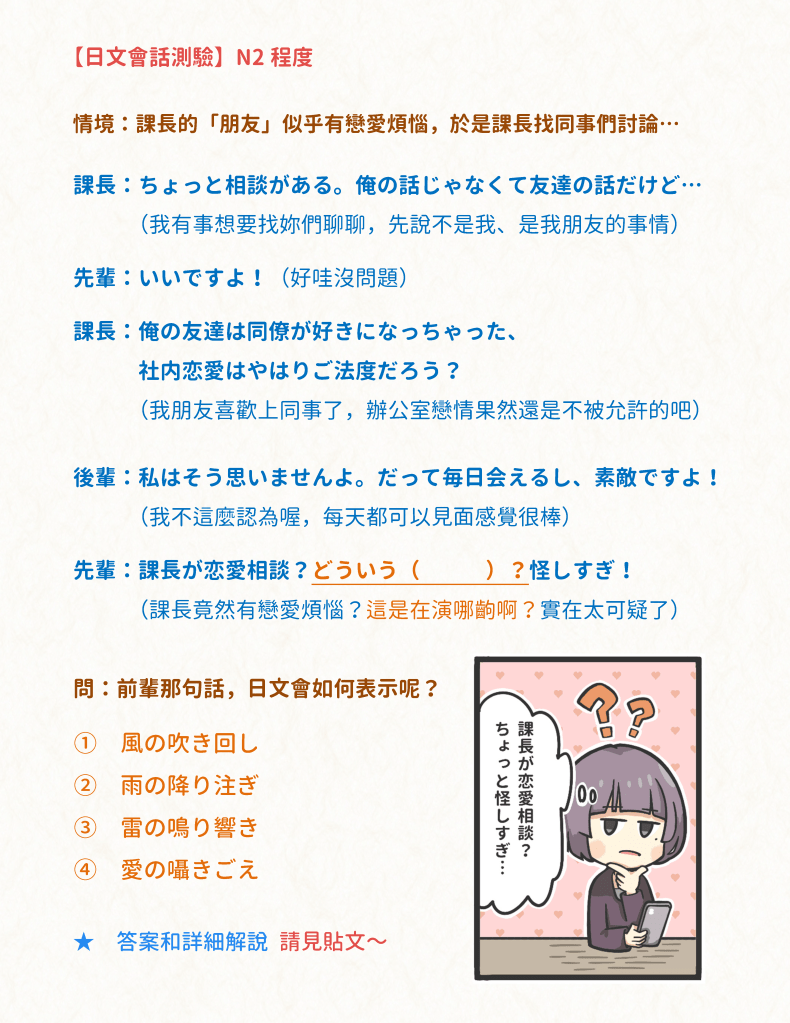 課長的「朋友」似乎有戀愛煩惱,於是課長找同事們討論,結果前輩的直覺太準了,一句話就說破…考考大家, 前輩那句話,日文會如何表示呢?