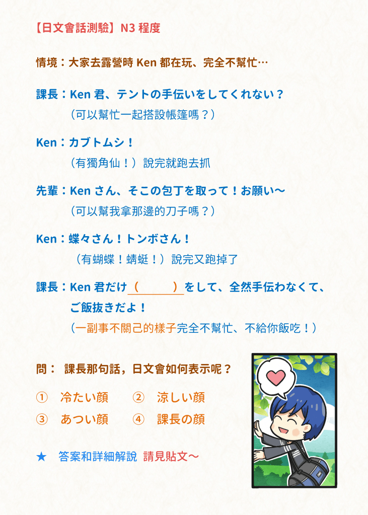 大家去露營時Ken都在玩、完全不幫忙然後課長生氣了…考考大家, 課長那句話,日文會如何表示呢?