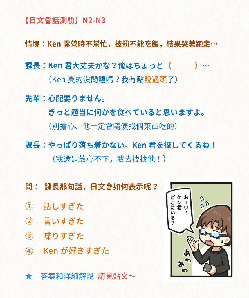 Filed under: viii 文法情境測驗 N3-N2 | Tagged: 自學日文、日文自學、日文句型、日文單字 | 【N2-N3】言いすぎた・話しすぎた・喋りすぎた,有什麼不同呢? 已關閉迴響。