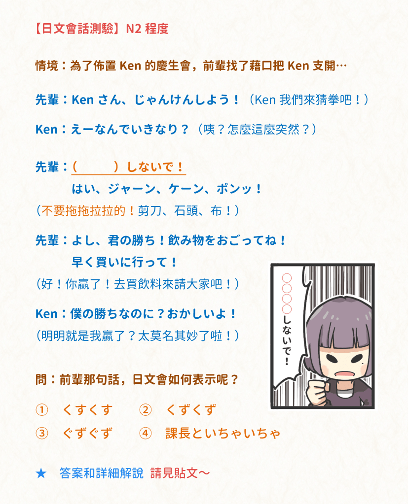 Filed under: ⅵ 日語字彙測驗 N3-N2 | Tagged: 自學日文、日文自學、日文句型、日文單字 | 【N2】ぐずぐず・くすくすー如何記憶日文的擬聲擬態語? 已關閉迴響。